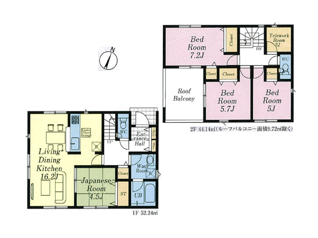 4LDK+テレワークルーム LDK16.2帖、主寝室7.2帖の広々設計。2居室から出入り可能なルーフバルコニーはお洗濯にとても便利です。